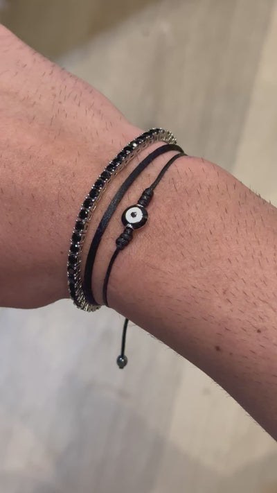 A Riviera Pegli de 3 mm traz brilho intenso e presença marcante, confeccionada em Prata de Lei com banho de Ouro Branco 18k e cravada com zircônias negras lapidadas, garantindo acabamento refinado e fecho seguro.
