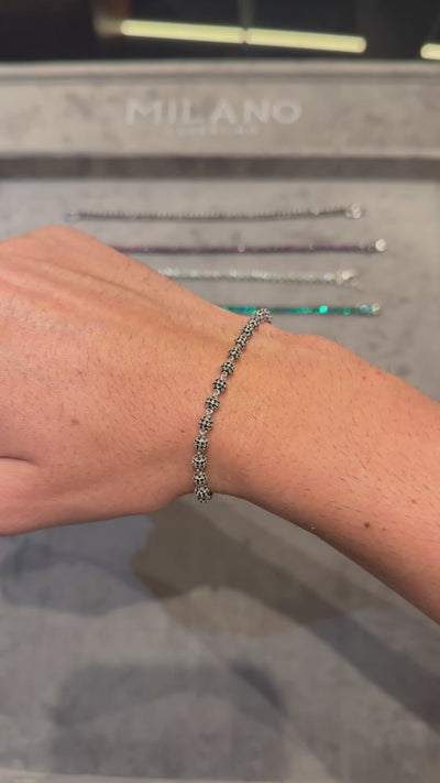 Minimalista e sólida, a Pulseira Orbita Nero é confeccionada em Prata 925 com banho de Ouro Branco 18k e cravada com zircônias negras lapidadas, que conferem profundidade e sofisticação. Seu design em elementos esféricos contínuos oferece textura e imponência com naturalidade, tornando-a um clássico contemporâneo de acabamento premium — perfeita para quem sabe que a verdadeira presença está nos detalhes.